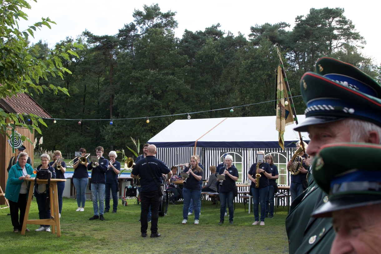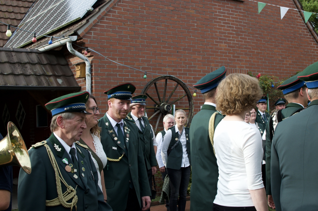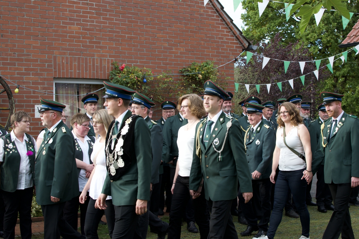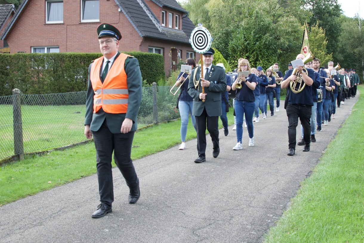 Die Vereinsmitglieder trafen sich in Uniform und mit Vereinsfahne um 16:45 Uhr am Waldhotel Hilgemann. Begleitet vom Musikverein Lienen marschierten die Schützenbrüder und –schwestern zur Binnheide, um dort die Schützenscheibe für das amtierende Königspaar Julian Hoge und Sarah Telljohann anzubringen.