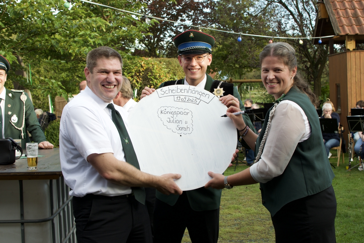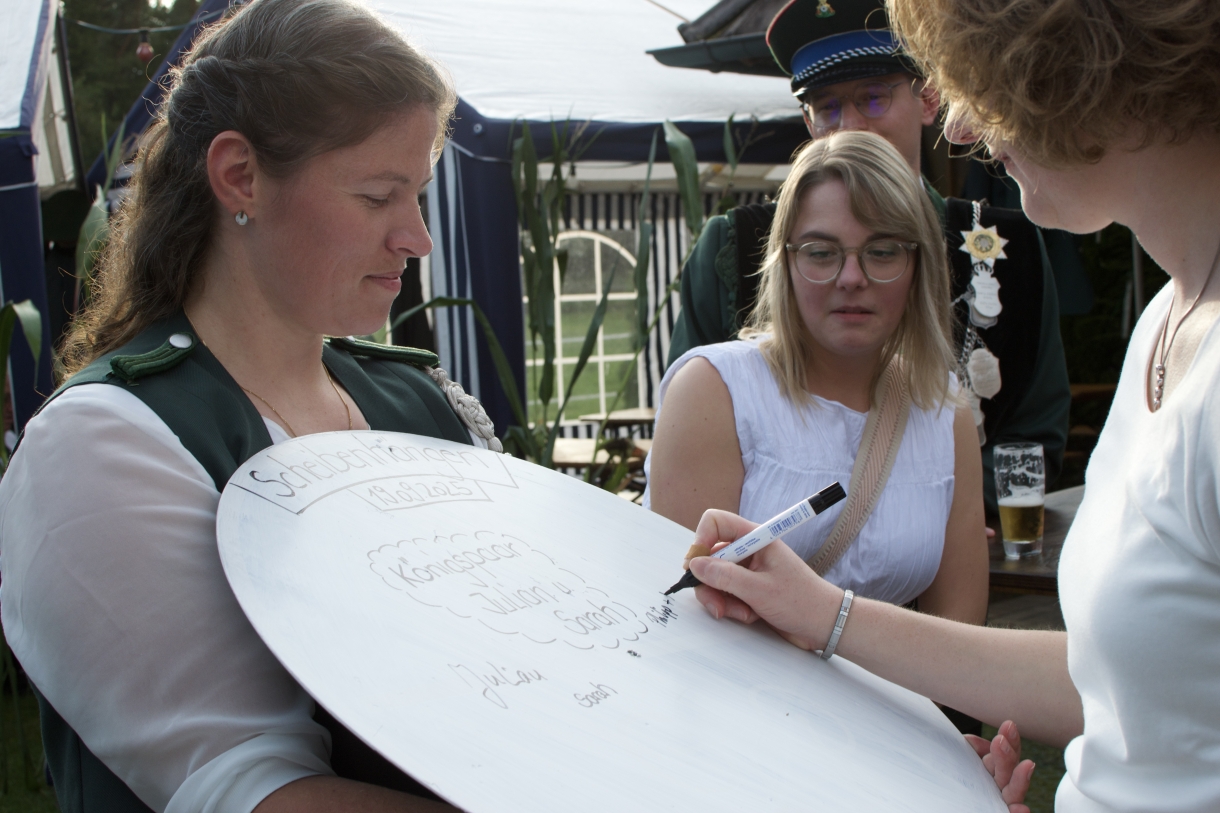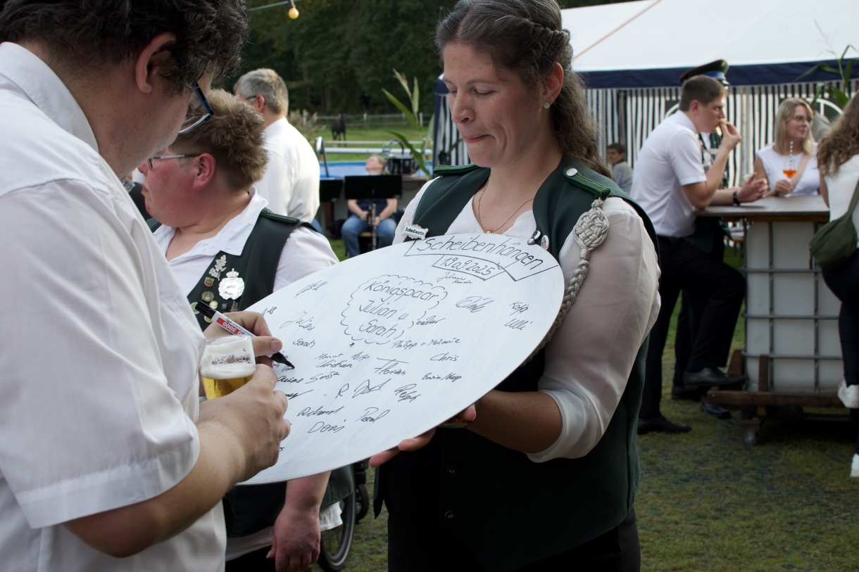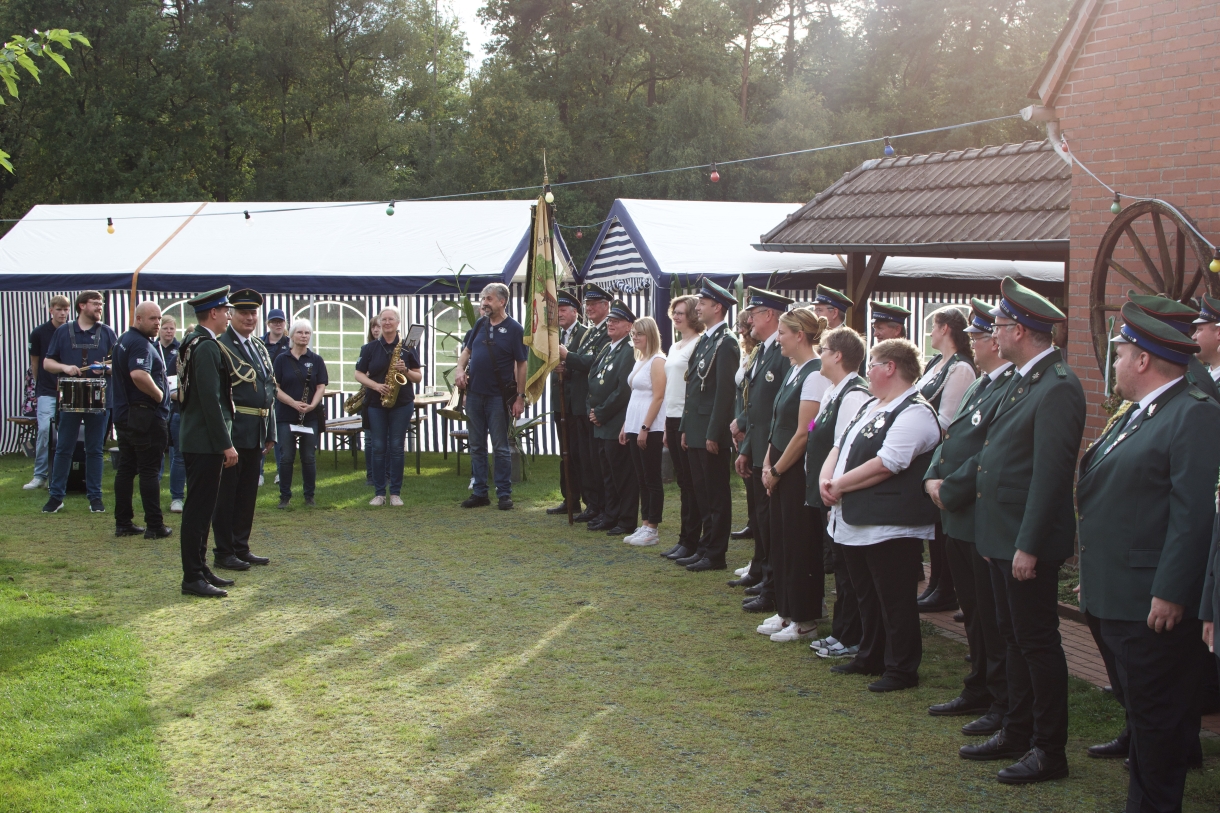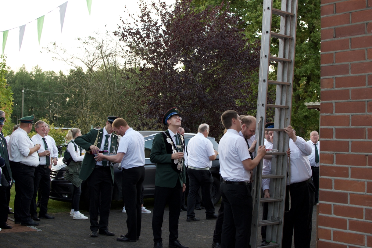 Die Vereinsmitglieder trafen sich in Uniform und mit Vereinsfahne um 16:45 Uhr am Waldhotel Hilgemann. Begleitet vom Musikverein Lienen marschierten die Schützenbrüder und –schwestern zur Binnheide, um dort die Schützenscheibe für das amtierende Königspaar Julian Hoge und Sarah Telljohann anzubringen.