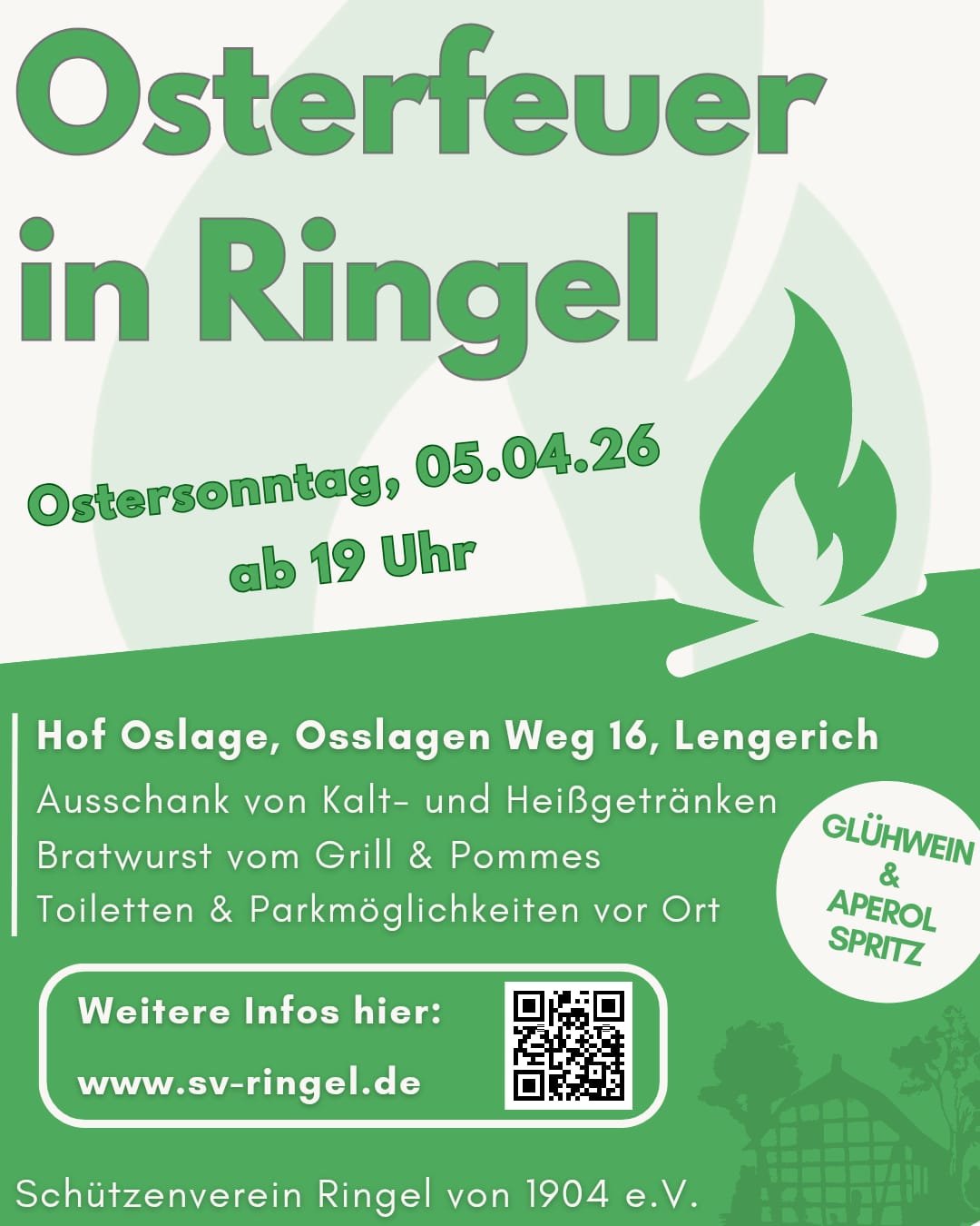 Der Schützenverein Ringel lädt am Ostersonntag, den 05. April ab 19.00 Uhr zum traditionellen Abbrennen des Osterfeuers ein.